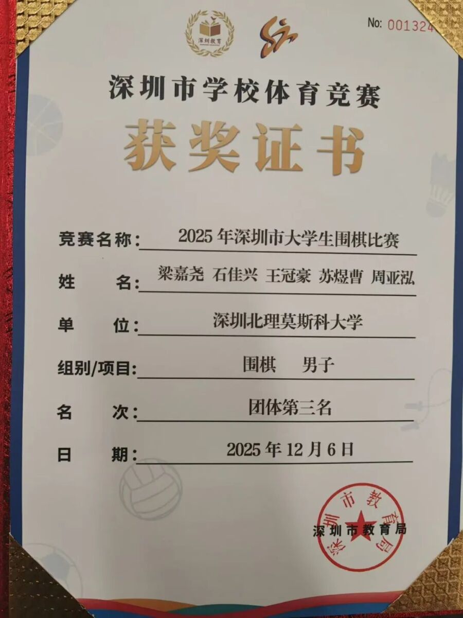 12月6日,在深圳理工大学举行的2025年深圳市大学生围棋锦标赛中,深圳北理莫斯科大学围棋队表现优异,由梁嘉尧、石佳兴、苏煜曹、周亚泓、袁璟玉、李庆南、王冠豪七位队员组成的代表队荣获团体第三名的好成绩。