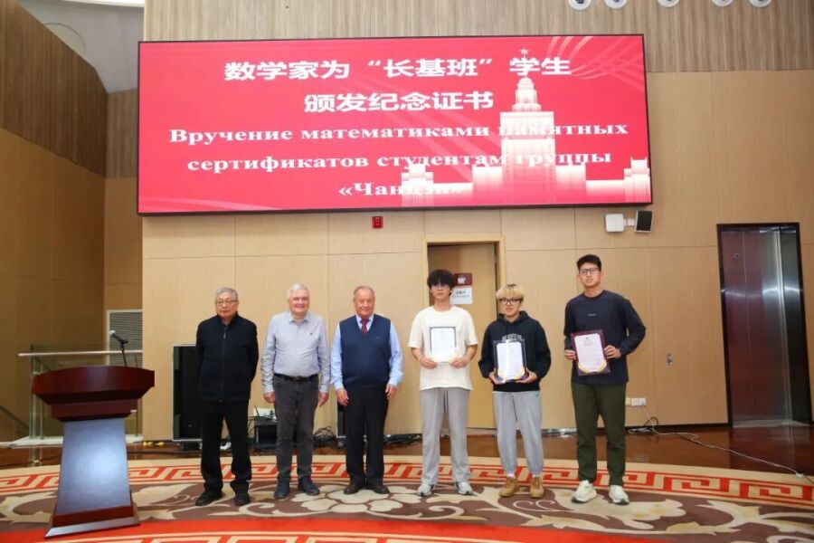 仪式最后,特尔特什尼科夫·叶甫盖尼、卡巴尼欣·谢尔盖、张益唐三位院士共同上台,为首届“长基班”的15名学生颁发纪念证书。