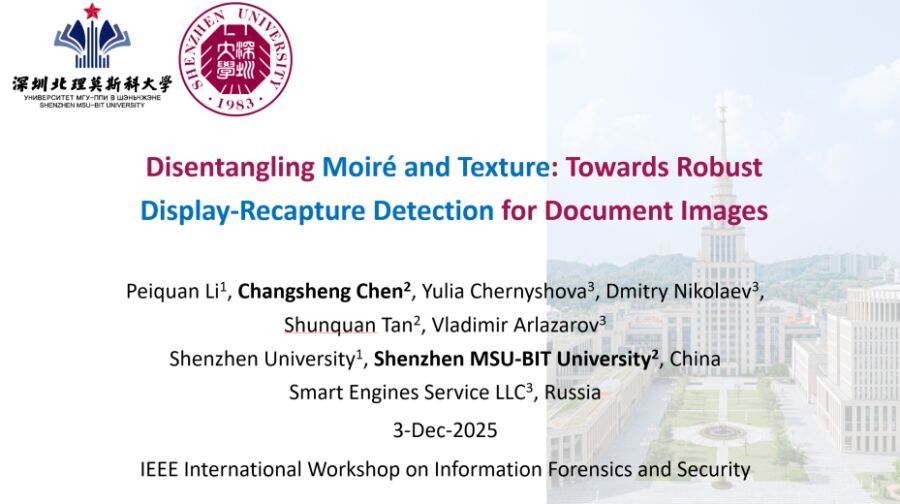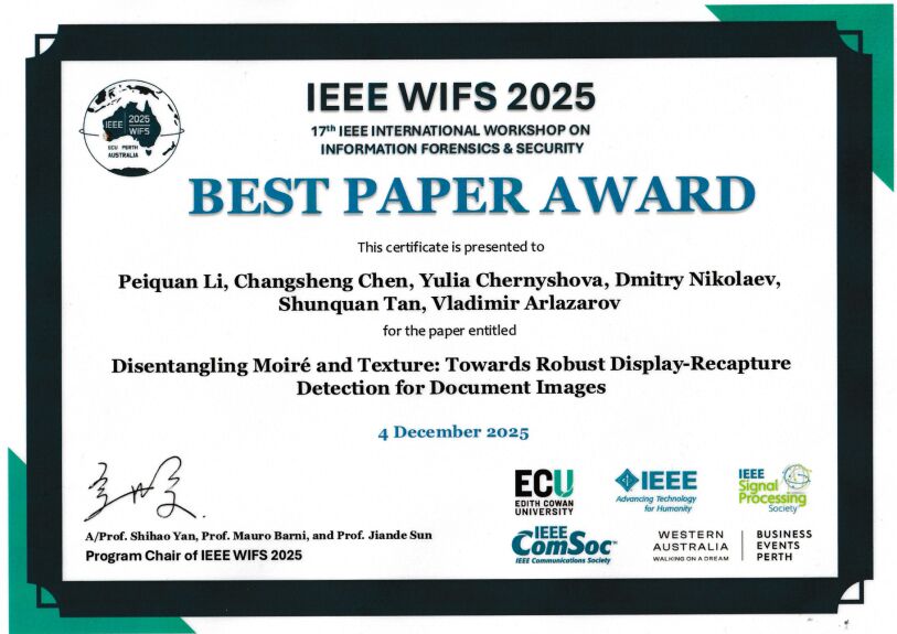 P. Li, C. Chen, Y. Chernyshova, D. Nikolaev, S. Tan, and V. Arlazarov, “Disentangling Moiré and Texture: Towards Robust Display-Recapture Detection for Document Images,” 17th International Workshop on Information Forensics and Security (WIFS), Perth, Australia, 2025.