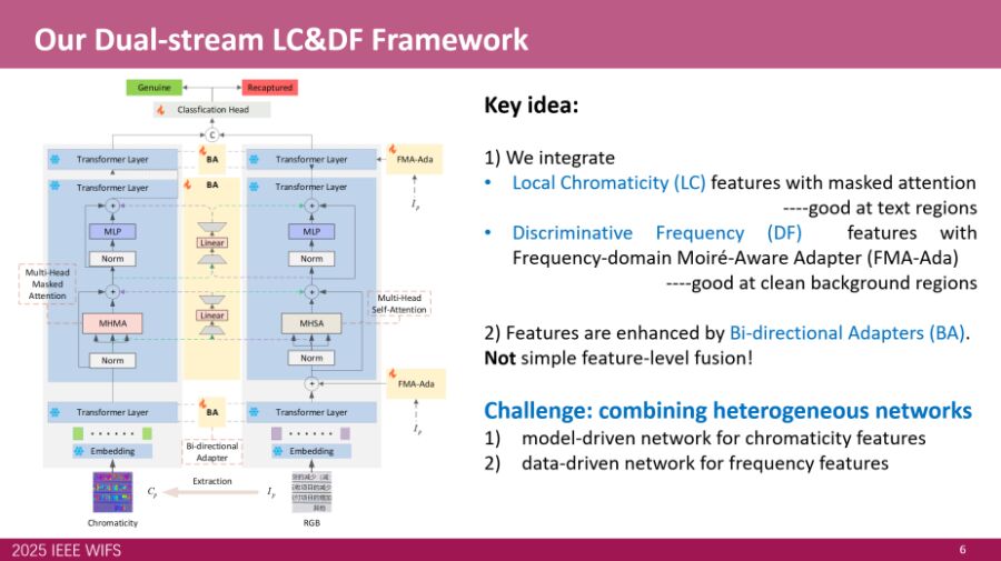 论文围绕数字文档在屏幕翻拍场景下面临的真实取证挑战,创新性提出一种联合色度特征与频域伪迹建模的双分支取证框架。通过Masked Attention抑制文档复杂纹理干扰,并利用Frequency-domain Moiré-Aware Adapter强化翻拍产生的莫尔纹等频域特征,实现了对显示翻拍伪迹的高效判别。实验结果表明,该方法在多项跨设备与真实场景测试中显著优于现有主流检测技术,突出展现了模型在复杂背景下区分真实纹理与翻拍伪影的能力,为构建高可信文档认证体系提供了重要技术突破。