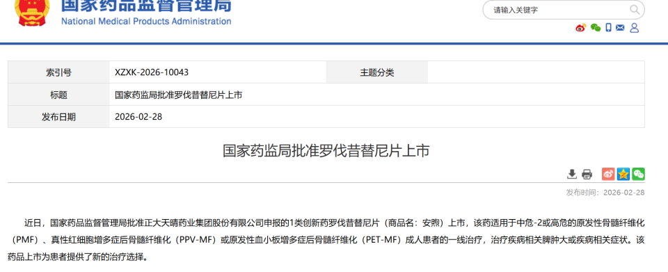 2月28日,药监局发布公告,批准正大天晴1类新药罗伐昔替尼片(商品名:安煦)上市,该药适用于中危-2或高危的原发性骨髓纤维化(PMF)、真性红细胞增多症后骨髓纤维化(PPV-MF)或原发性血小板增多症后骨髓纤维化(PET-MF)成人患者的一线治疗,治疗疾病相关脾肿大或疾病相关症状。