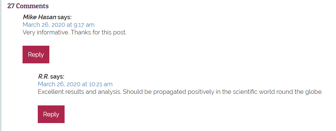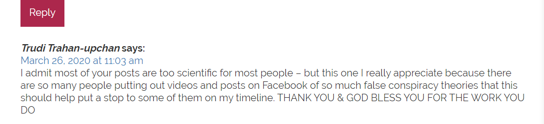 还有人表示,“我认为您的大多数文章对大多数人来说太科学了,我真的很感激,因为有太多人在脸书上发布了太多虚假阴谋论的视频和帖子,这会对让一些人在疫情时间上释放假消息画上个句号”。